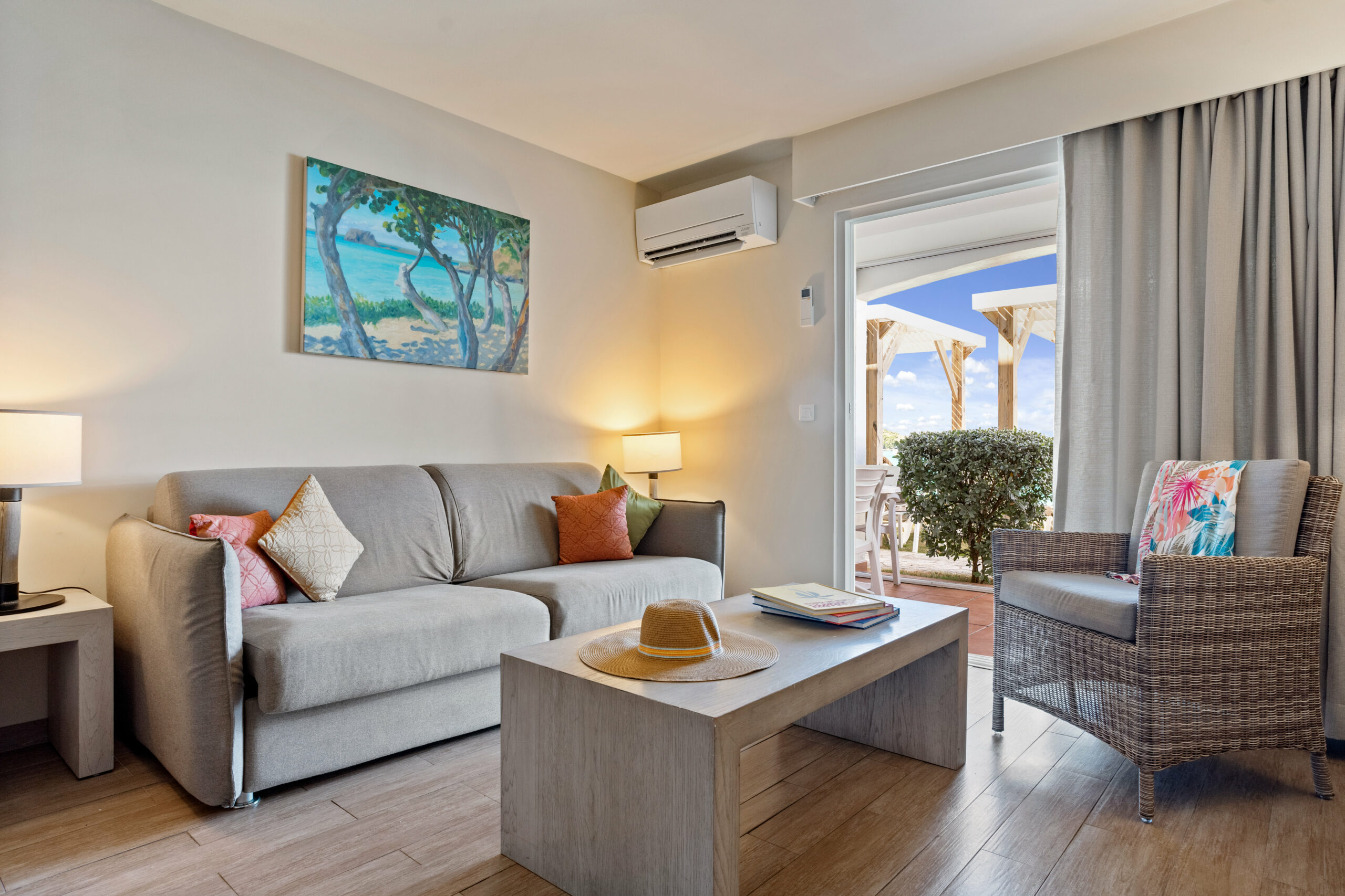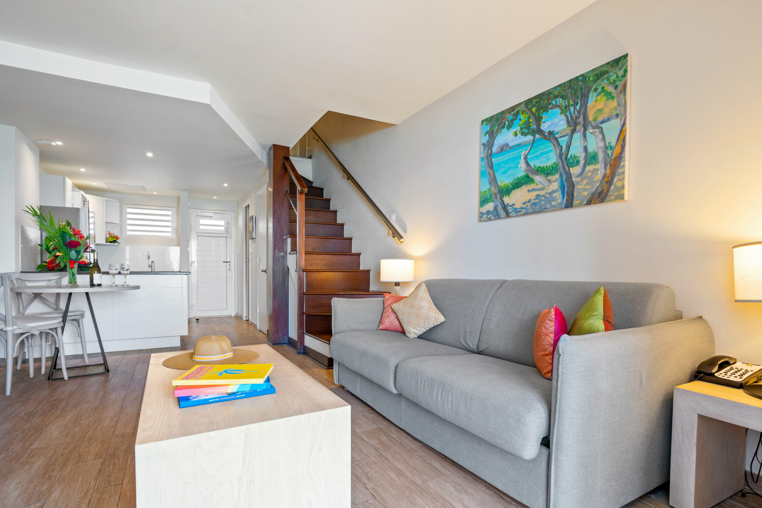 Two level Townhouses, with the ground level being the living area, a modern, fully equipped kitchen, full-size convertible sofa, ½ bath, and private terrace, directly on the beach