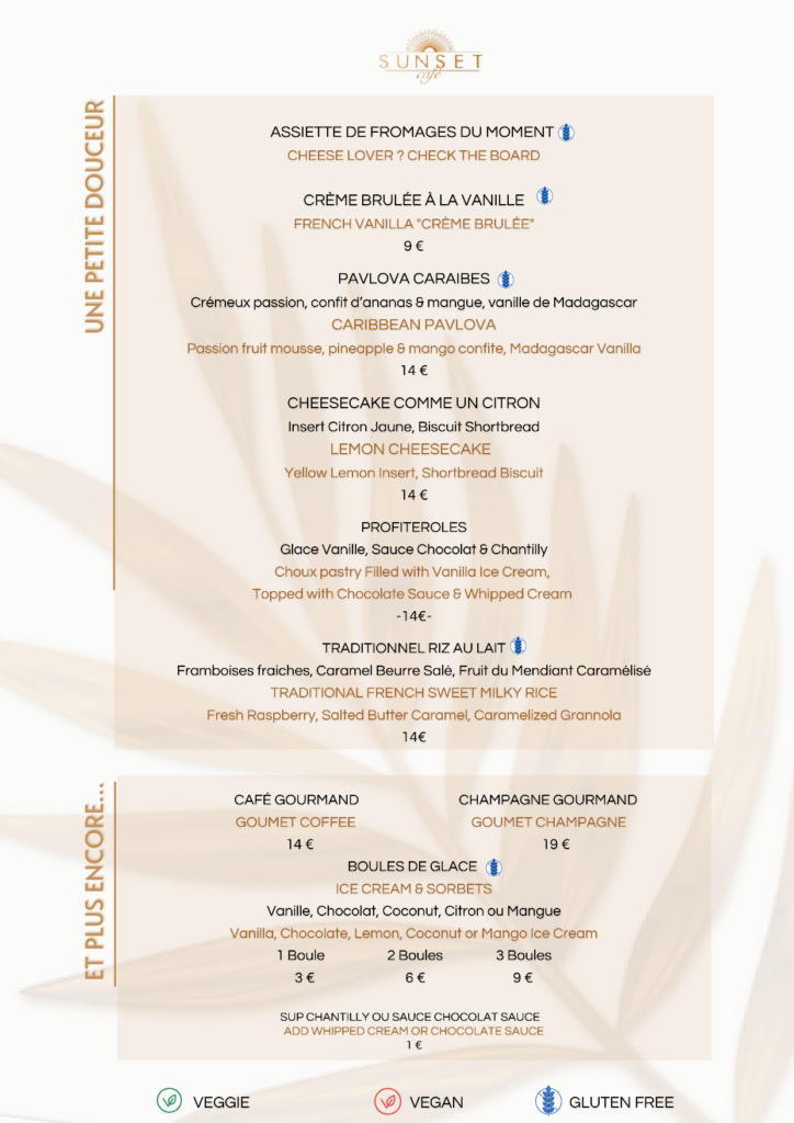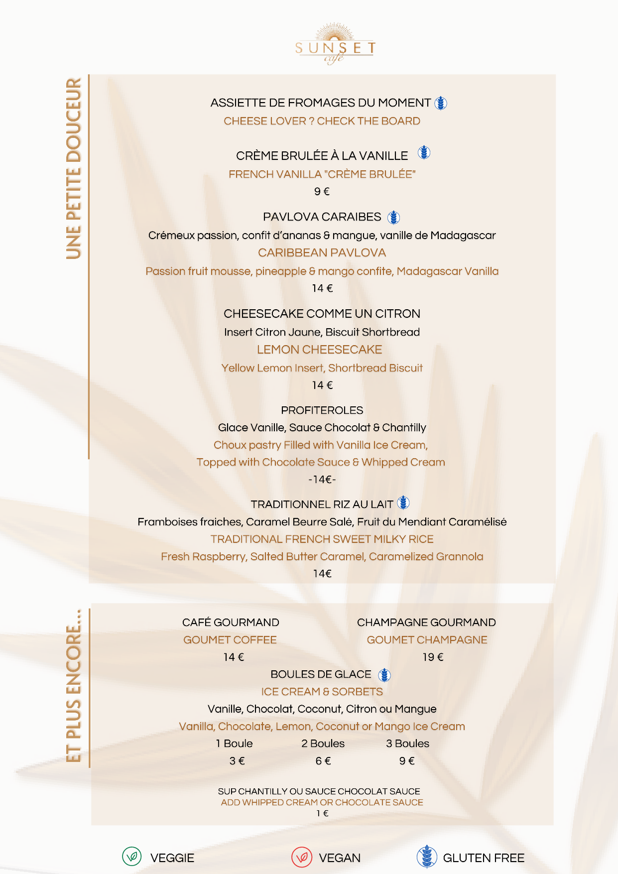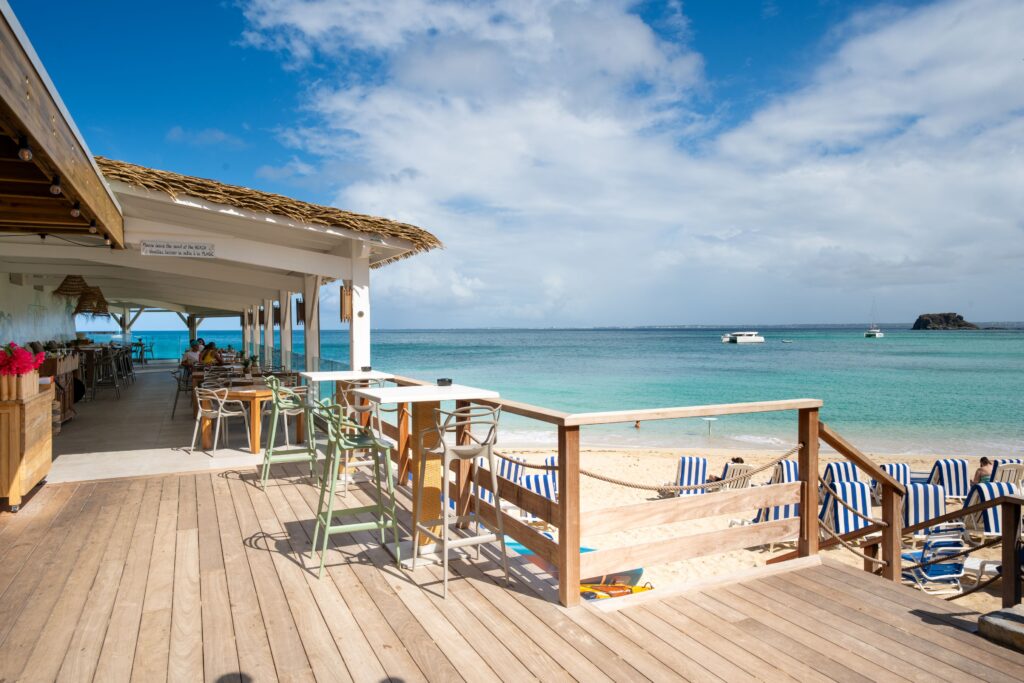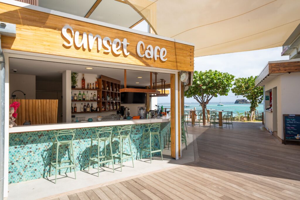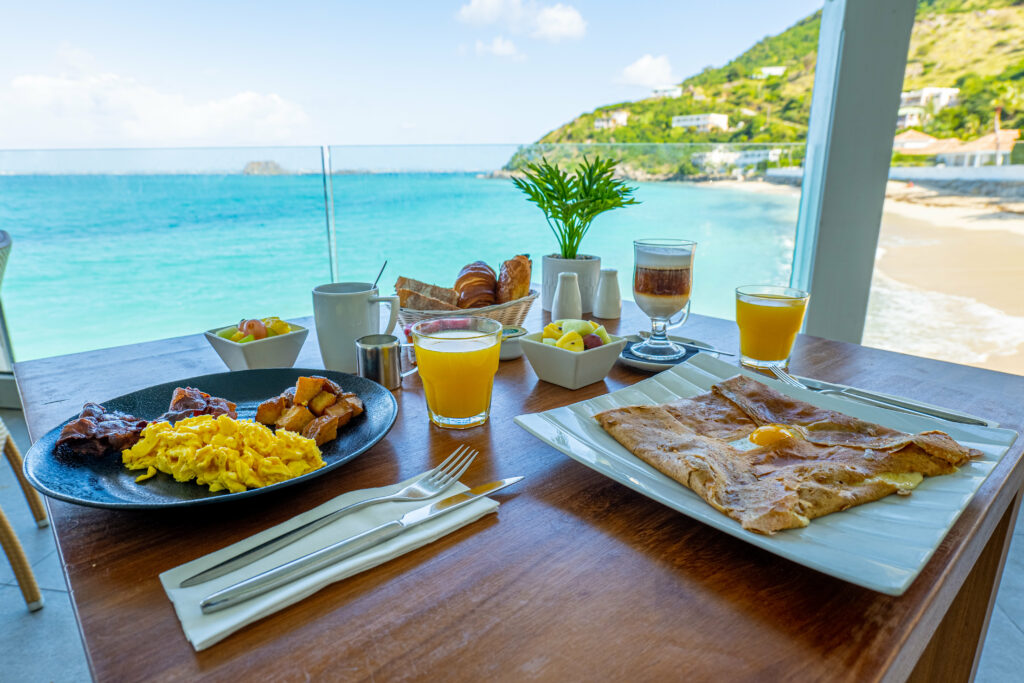 The Sunset Café and Bar overlooks an incredible palette of turquoise and blue across the bay and Petite Plage beach. Visitors come for the breathtaking views and return once they discover our passion for culinary delights and commitment to service. Open daily for breakfast, lunch, and dinner, The Sunset Café invites guests to enjoy elegant open-air dining with a picturesque ocean backdrop or the tasteful ambiance of dining indoors. Start your day with a delectable French pastry or a full breakfast with favorites like omelets and eggs Benedict. For lunch, enjoy an energizing meal—perhaps a hearty burger to savor by the beach. In the evening, the café transforms into a romantic candle-lit French restaurant, where fresh Moules-frites, delicious steaks, and mouthwatering desserts are paired with views of the serene bay and distant Anguilla.