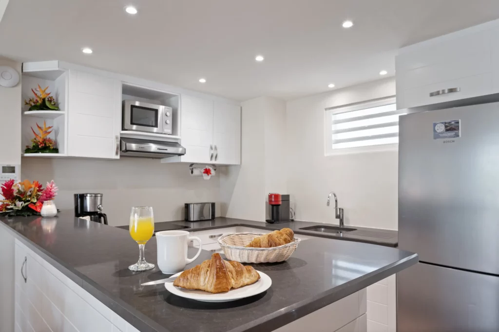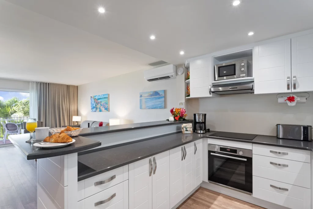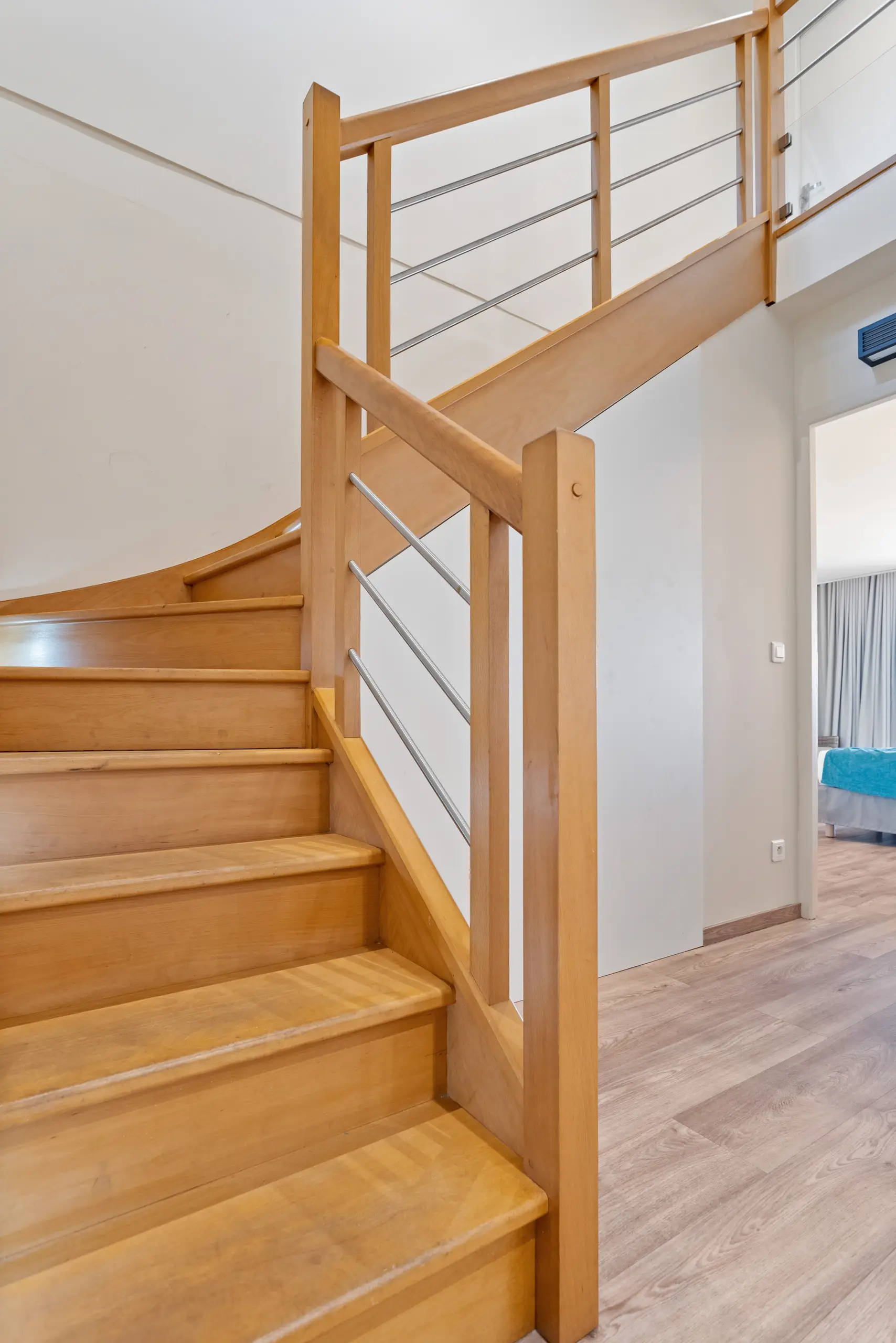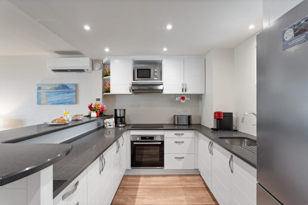 Le rez-de-chaussée se compose d’une cuisine moderne entièrement équipée, d’un salon avec un grand canapé convertible, ainsi que d’une chambre avec un lit king et une salle de bains séparée. Un grand balcon meublé et aéré s’étend sur toute la longueur de la suite.
