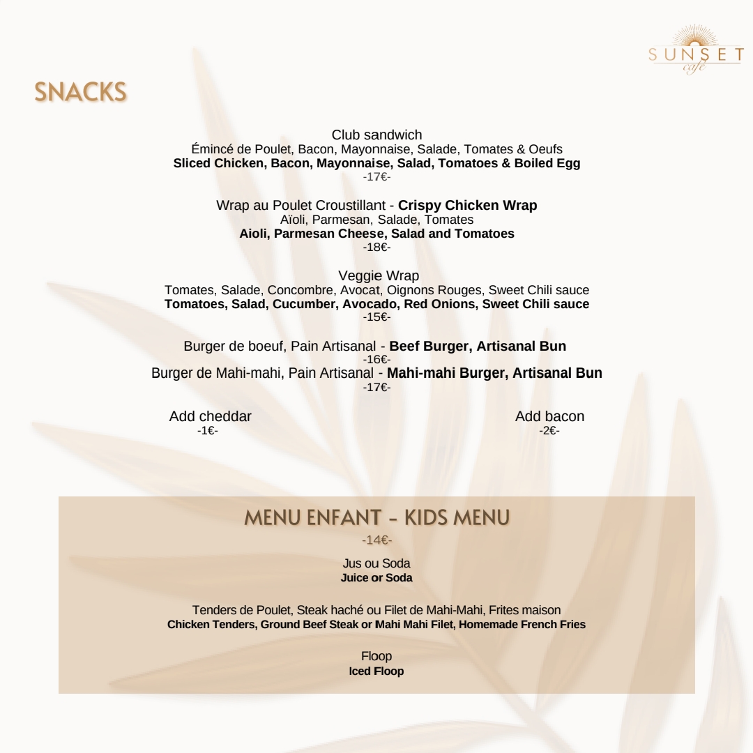 *Les horaires d’ouverture du Sunset Café peuvent varier en basse saison (septembre et octobre).